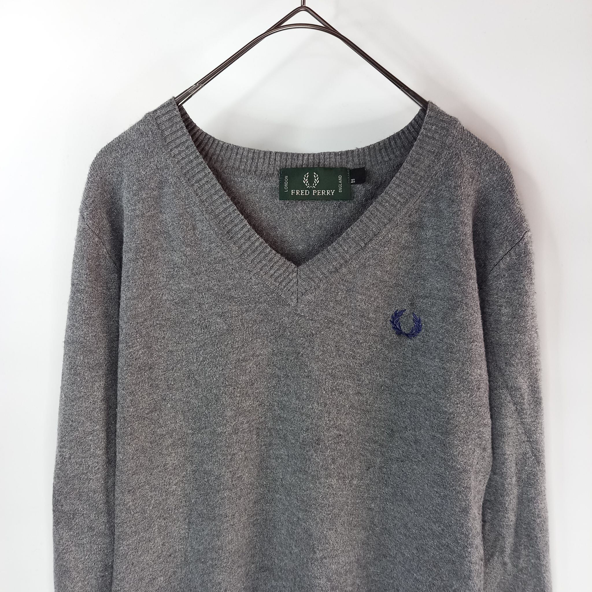 フレッドペリー カシミア Vネックセーター 刺繍ロゴ グレー ユーロ古着