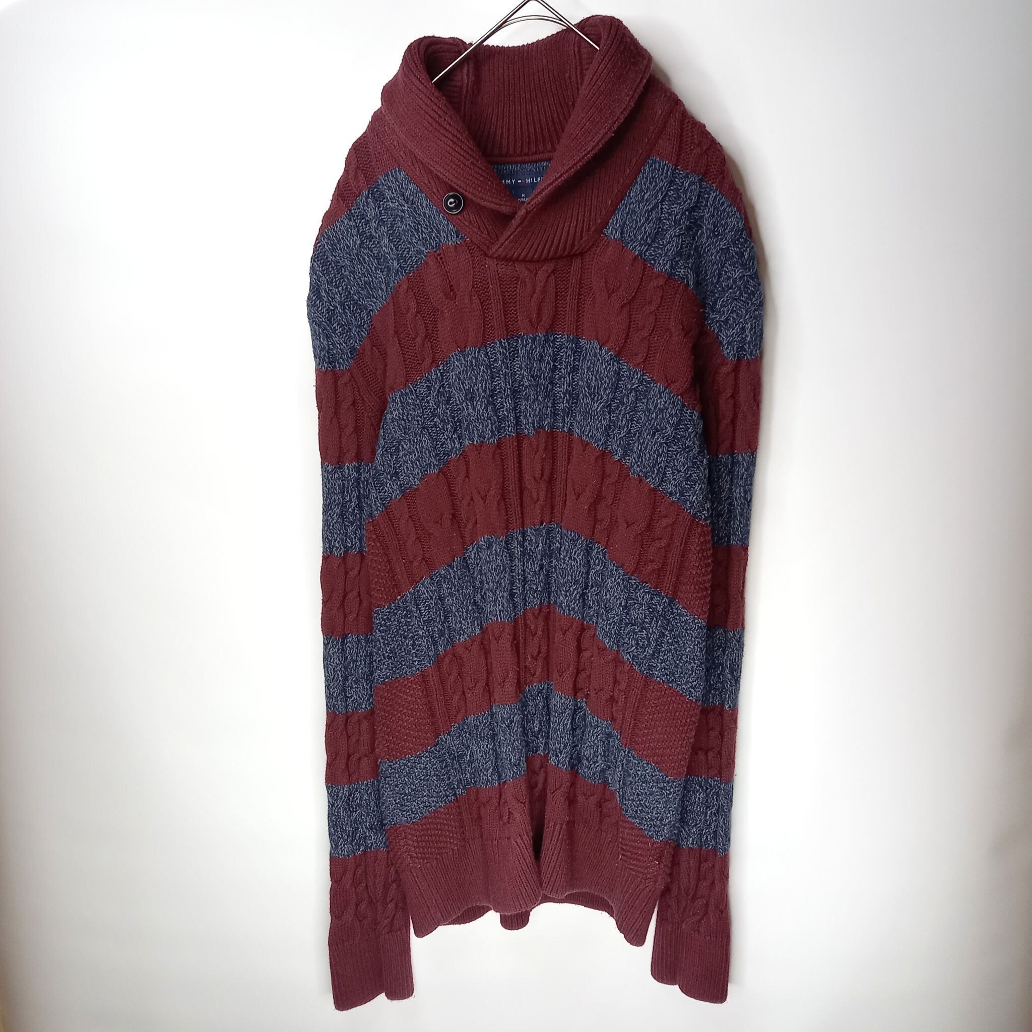 トミーヒルフィガー ショールカラー ケーブル編み コットンセーター ボーダー M