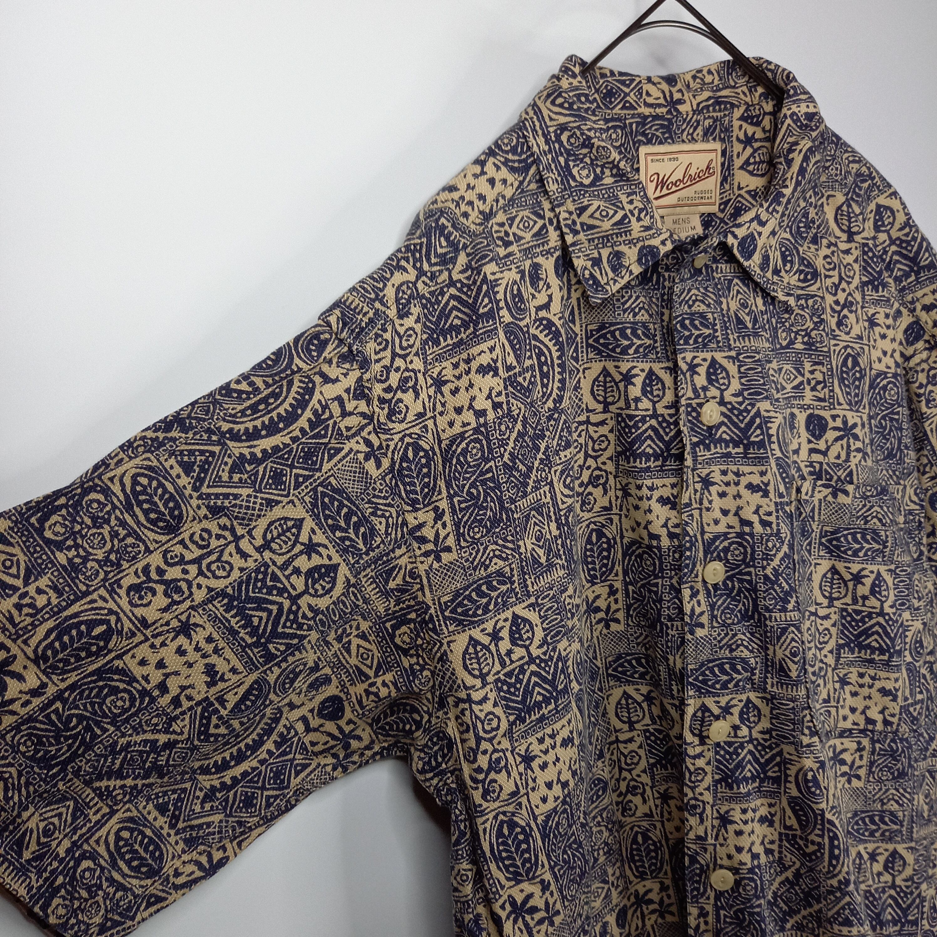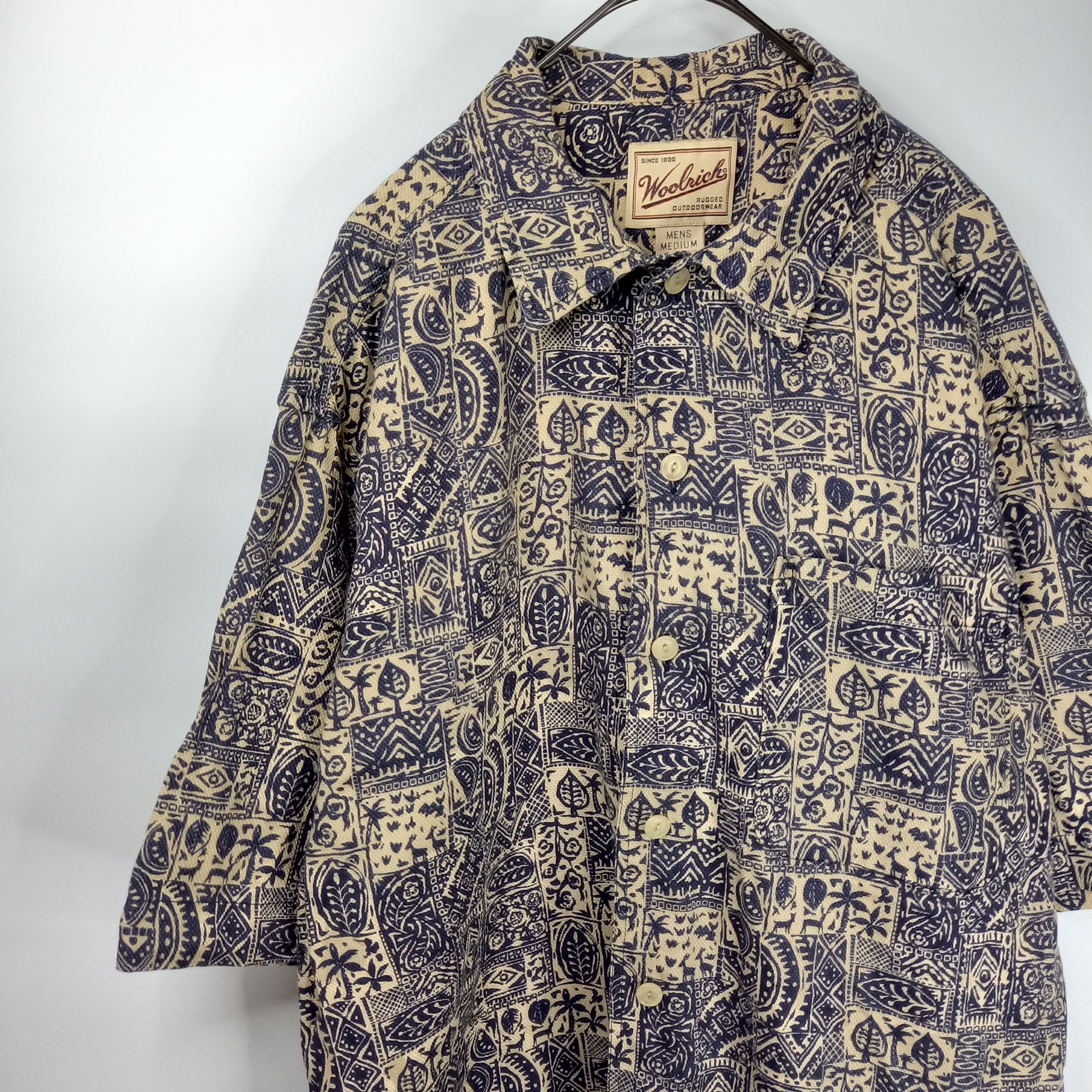 90s ウールリッチ 総柄シャツ 半袖 ネイティブ ネイビー M