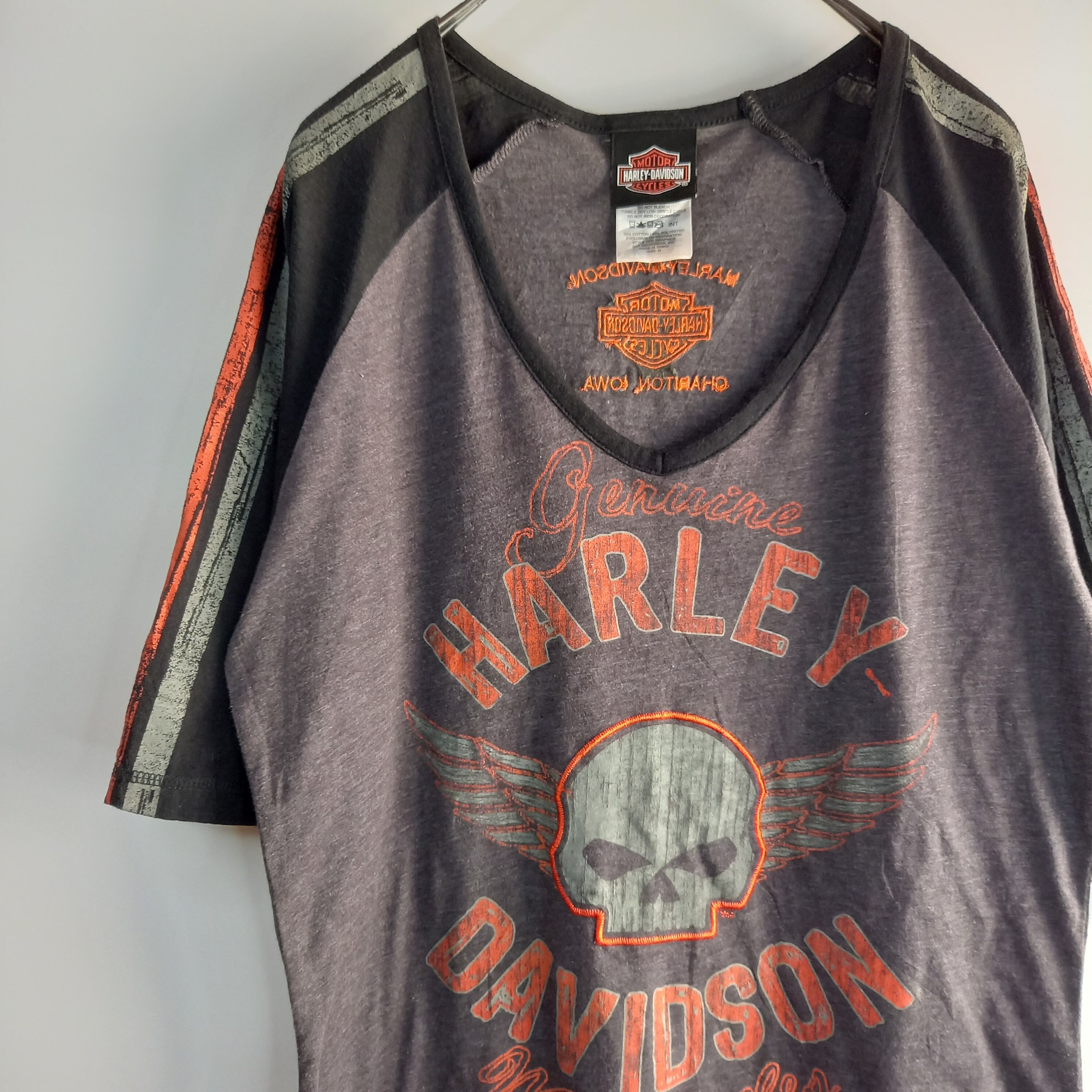 ハーレーダビットソン Vネック ラグランTシャツ 刺繍 ビッグロゴ M