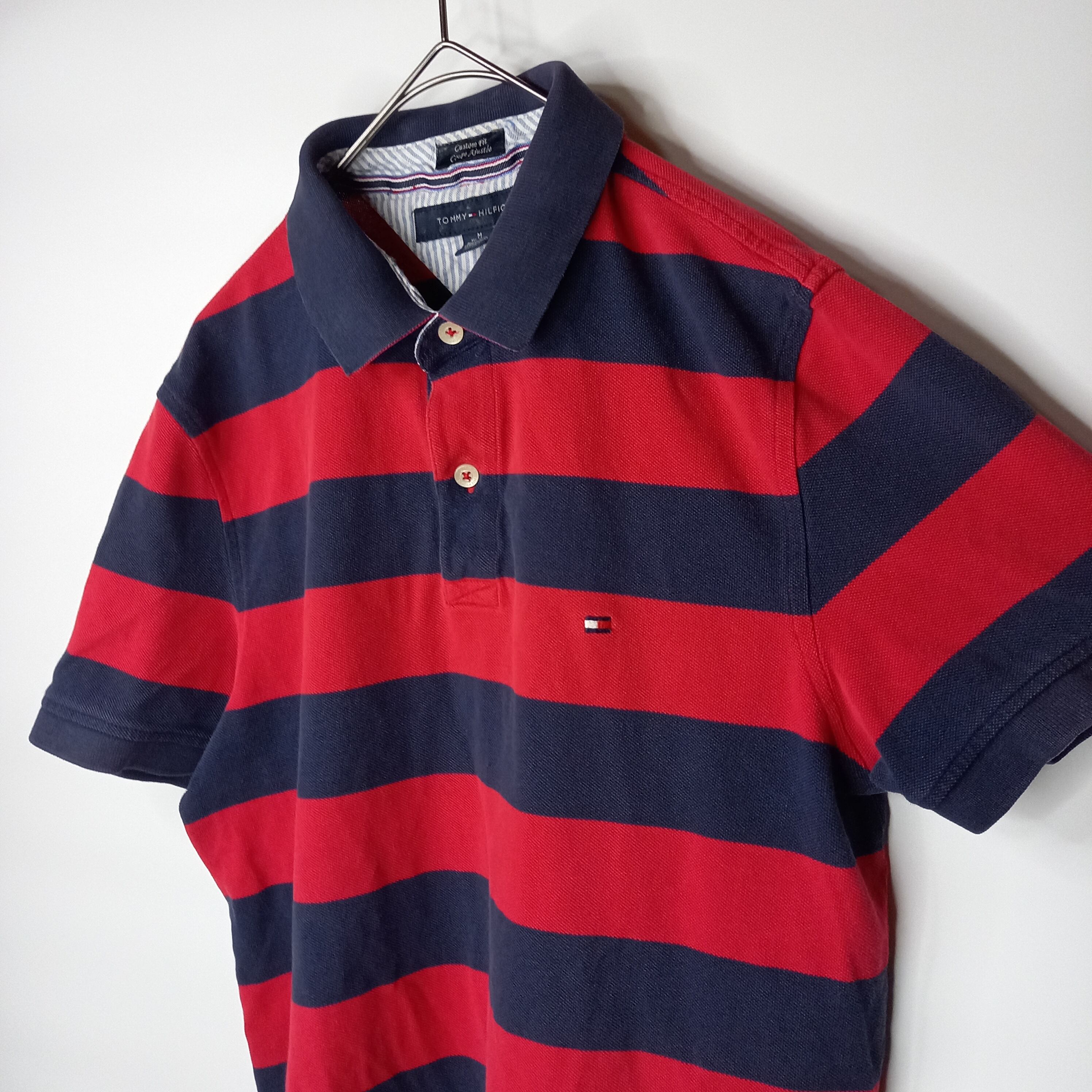 トミーヒルフィガー ラガー ポロシャツ 半袖 ボーダー 刺繍ロゴ 赤