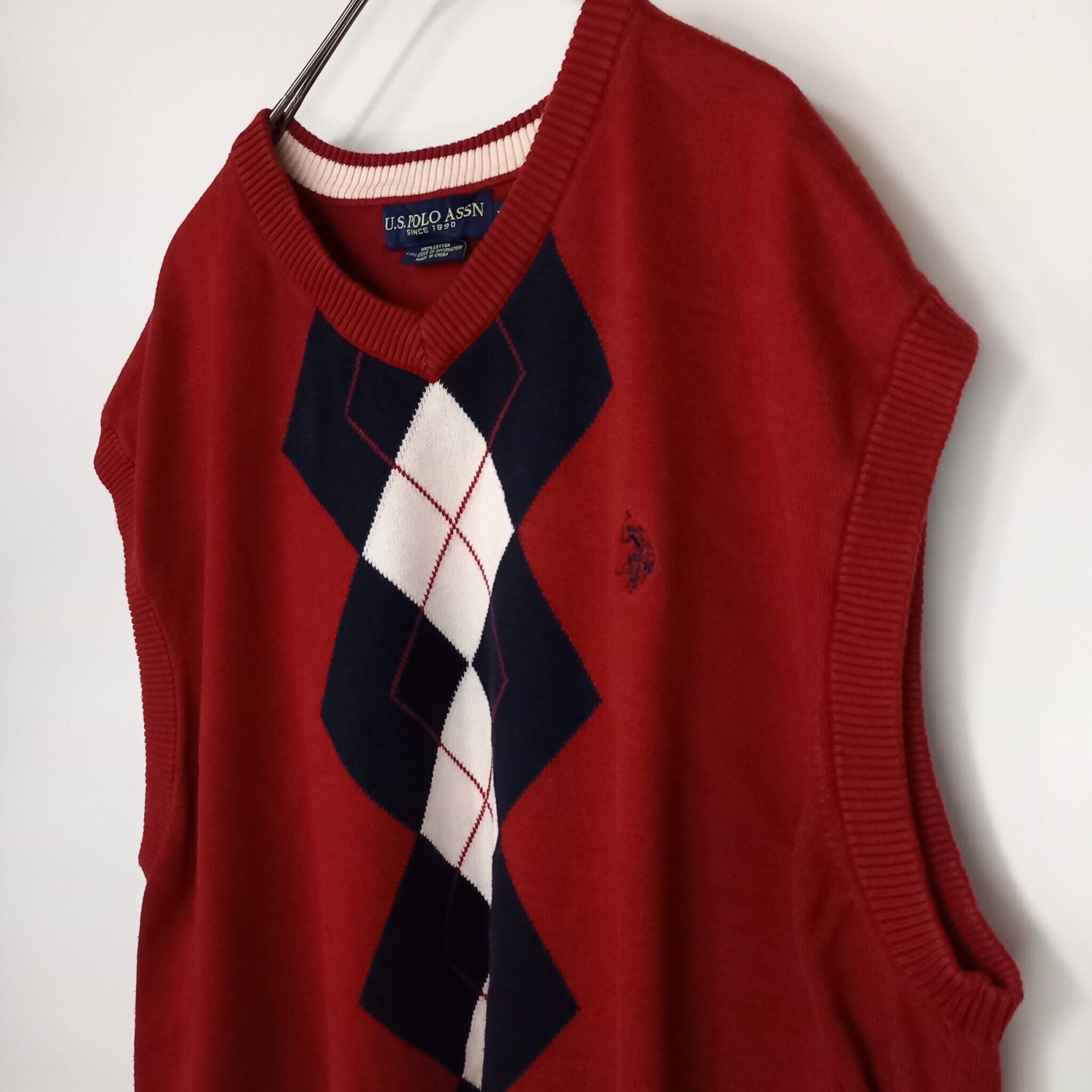 U.S. POLO ASSN. Vネック コットン ニットベスト セーター 刺繍ロゴ アーガイル オーバーサイズ レッド XXL