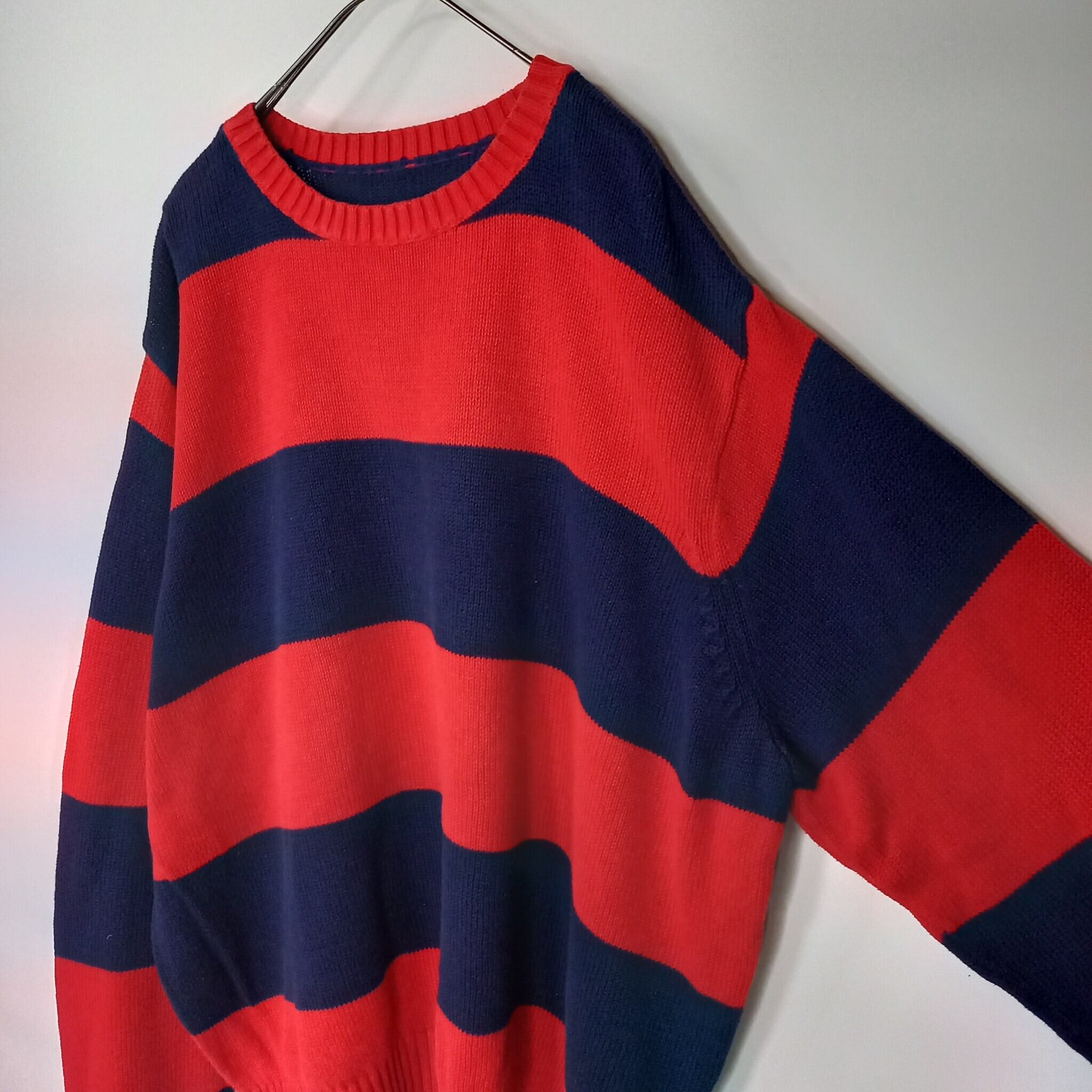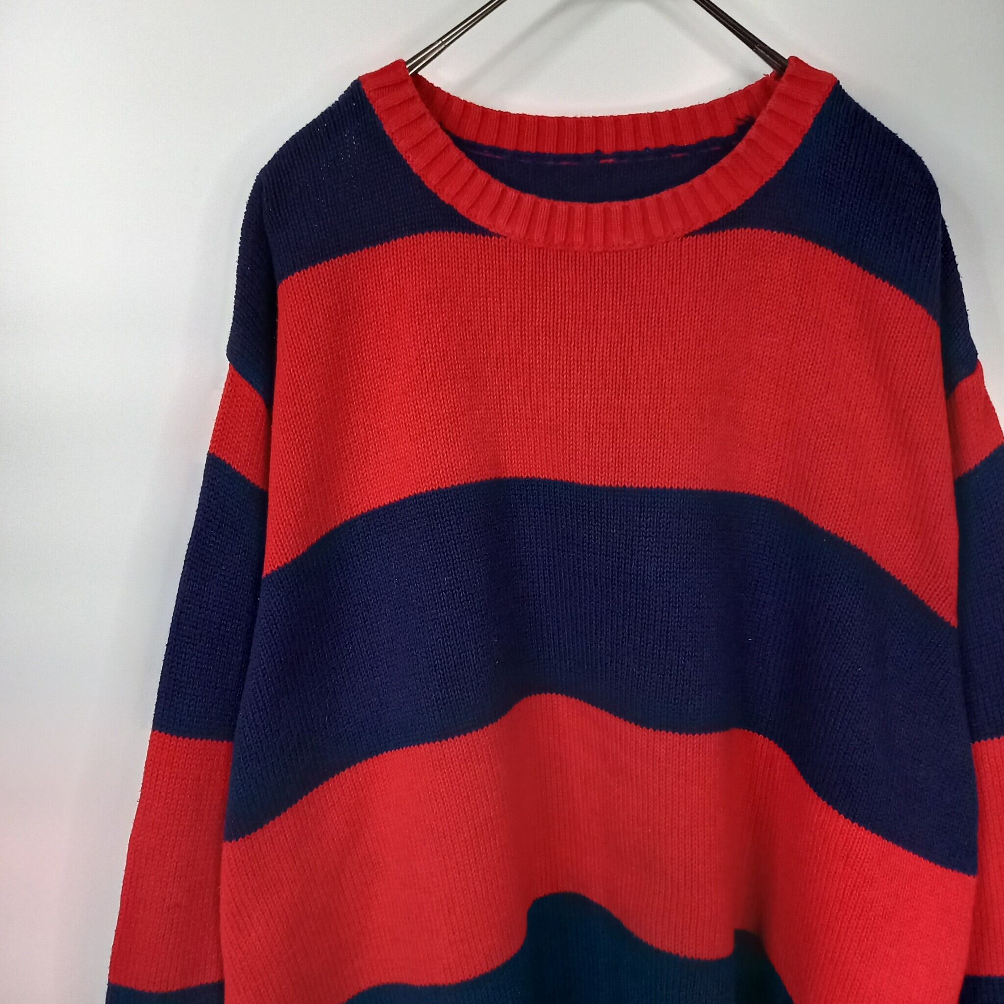 クルーネック コットンニット セーター 無地 中厚手 ボーダー オーバーサイズ レッド XL