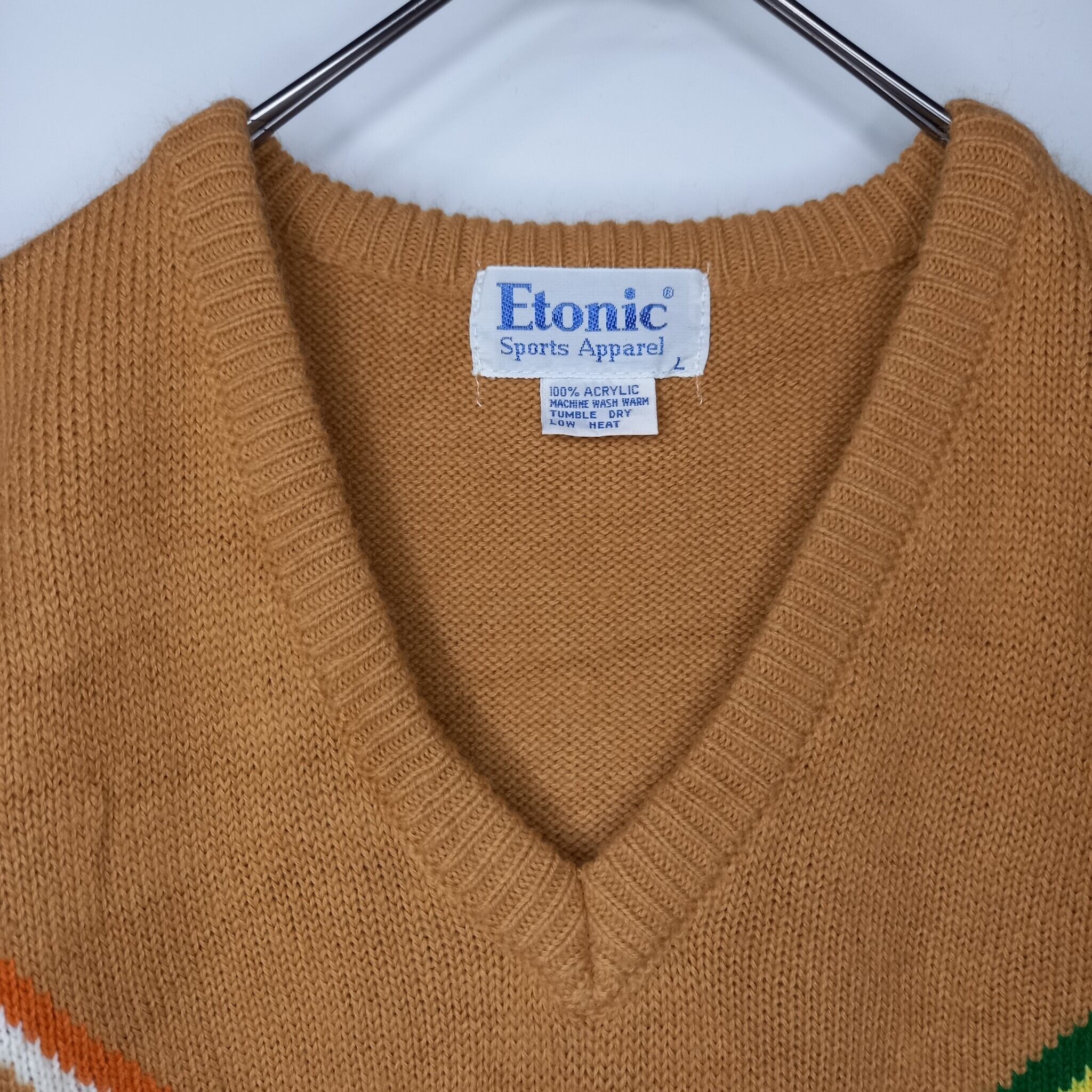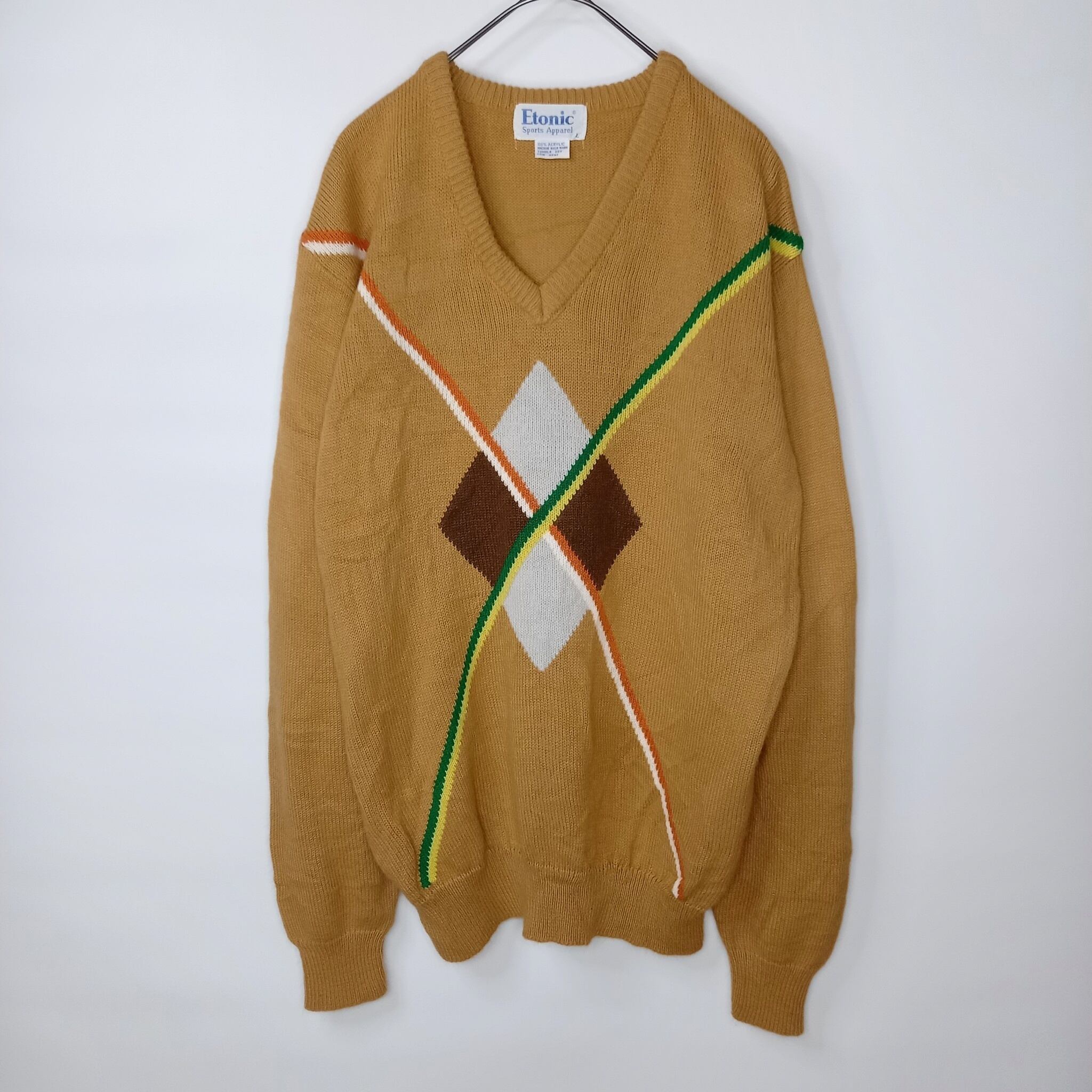 90s 台湾製 Etonic Sports Apparel Vネック アクリルニット セーター アーガイル 中厚手 ベージュ L