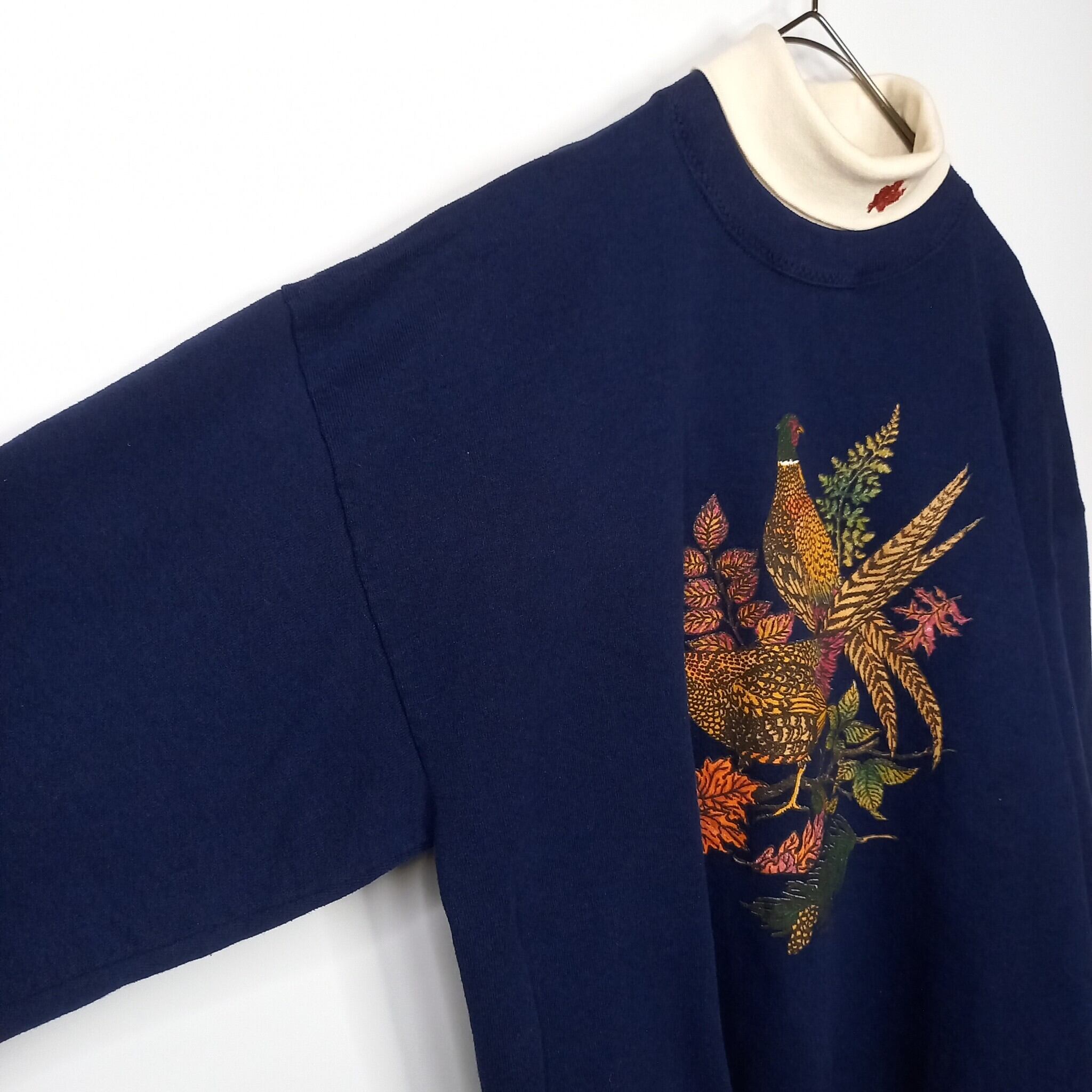 90s アメリカ製 ハイネック スウェット トレーナー アニマル柄 プリント ネイビー L